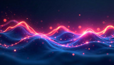 Pink and blue neon lines create a wavy pattern against a dark background