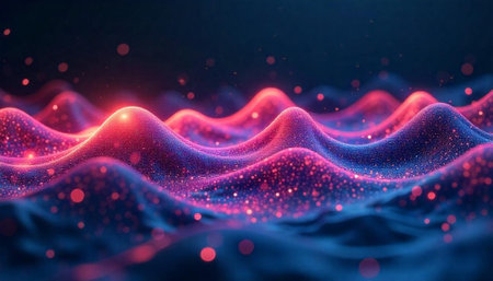 3d illustration of abstract landscape with blue and pink waves and glowing particles