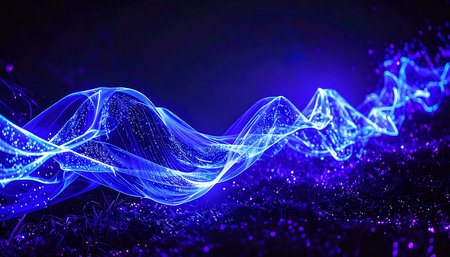 Abstract wave with glowing particles over dark blue background