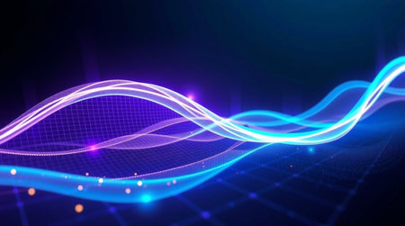 A dark, textured surface is overlaid with smooth, wavy lines of glowing neon light in shades of purple and blue, creating a sense of fluid motion.