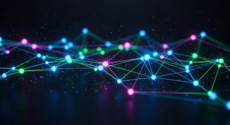 This visually stunning abstract image showcases a network of colorful nodes and vibrant lines on a dark background, symbolizing connectivity and technology.