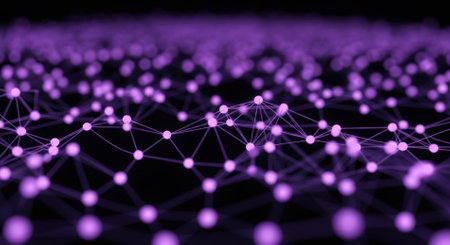A vibrant abstract network of interconnected glowing purple nodes on a dark background, representing digital communication, data flow, and technological concepts like artificial intelligence and neural networks.