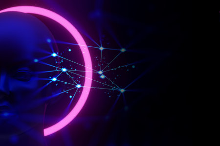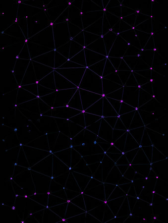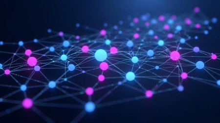 A glowing network of interconnected nodes in vibrant neon pink and cyan, linked by lines, creates a digital, abstract pattern on a dark background,...