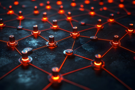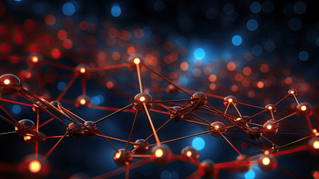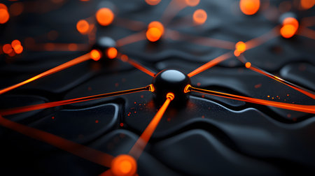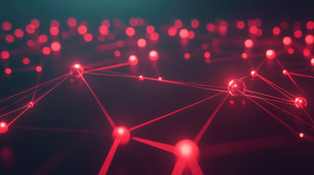 A close-up of an abstract network representation featuring interconnected glowing red nodes on a dark textured background. the scene illustrates concepts of digital communication, connectivity, and modern technology. Generative AI