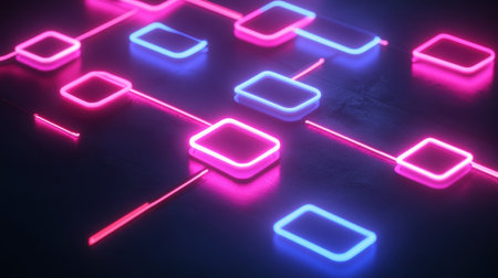 A visually stunning abstract design featuring glowing neon squares and lines in vibrant pink and blue colors on a dark surface. Perfect for modern digital projects.