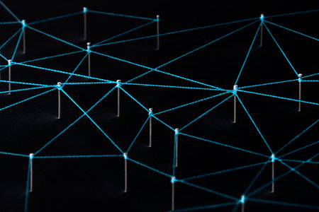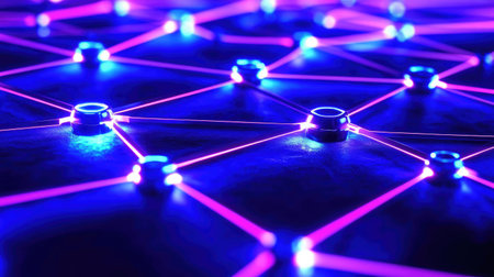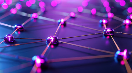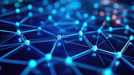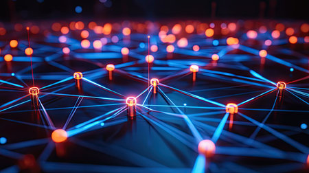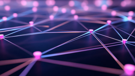 A stunning close-up of a futuristic network showcasing glowing nodes and connecting lines, emphasizing themes of technology, communication, and digital connectivity.