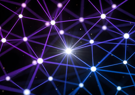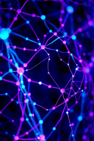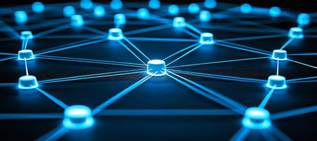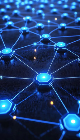 Vibrant digital visual featuring blue neon nodes and glowing connections on a dark background, representing modern network technology and data transmission systems.