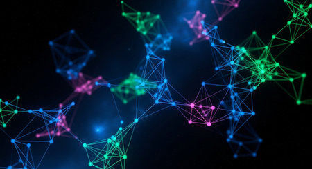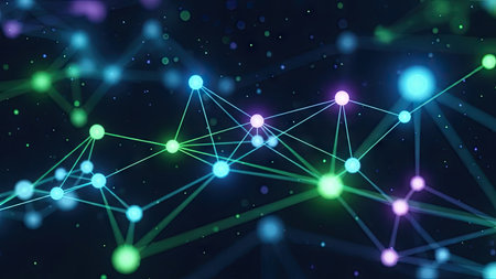 Discover a captivating abstract network of glowing nodes and colorful connections, perfect for technology themes, innovation projects, and digital art explorations.