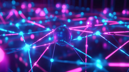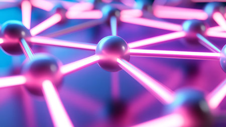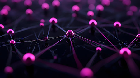 A dynamic network of interconnected nodes vibrantly displayed in neon pink against a dark backdrop. A modern, futuristic ambiance creates depth and intrigue in the design.