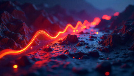 Glowing orange waveform over red liquid surface abstract backdrop