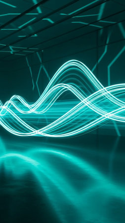 Abstract, glowing teal light trails form dynamic wavy lines and reflections in a dark, modern room, creating a sense of futuristic energy and movement.
