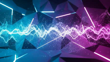 An abstract digital visualization depicts a sound wave with glowing particles and geometric shapes, illuminated by vibrant blue and purple neon lights against a dark background.