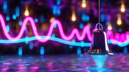 This modern abstract artwork showcases a vibrant bell illuminated by neon light waves against a colorful background, symbolizing sound and energy.