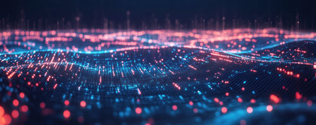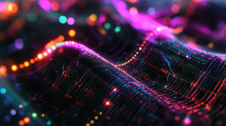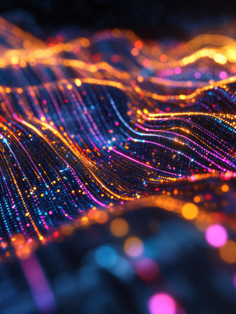 Abstract digital background with glowing, colorful waves and data points on a dark blue gradient, a futuristic technology concept. --ar 5:2 --v 6.1 Job ID: 1aa54045-c641-482b-9b7a-8cad178cc5c6