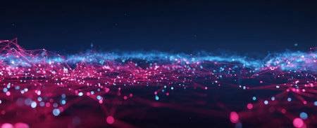 Abstract digital landscape with interconnected dots and lines, in shades of pink and blue, dark background