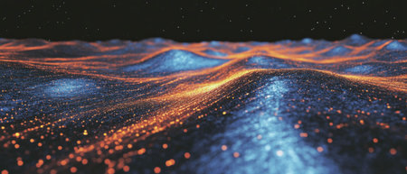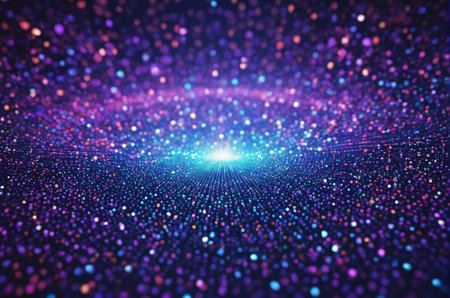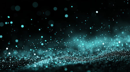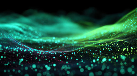 Blue showing abstract glowing particles in swirling patterns with vibrant blue green and purple lights against a dark background creating a sense of...