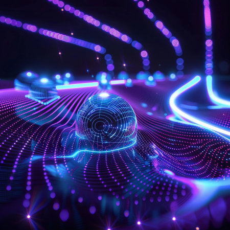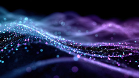 A mesmerizing field of tiny glowing purple particles forming a wave-like structure, representing energy flow and futuristic aesthetics.