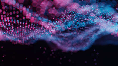 Glowing pink and blue particles arranged in wave patterns, digital style, on a dark blurred background, concept of futuristic technology