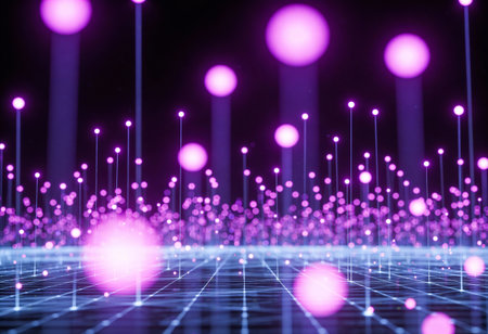 Pink and white glowing dots forming digital waves over a violet background with soft motion and depth.