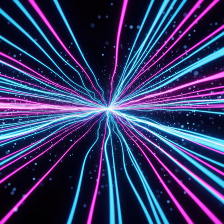 Experience a vibrant explosion of digital energy with this stunning abstract image. Neon pink and cyan light streaks radiate outward from a bright center, creating a sense of dynamic motion and futuristic beauty.
