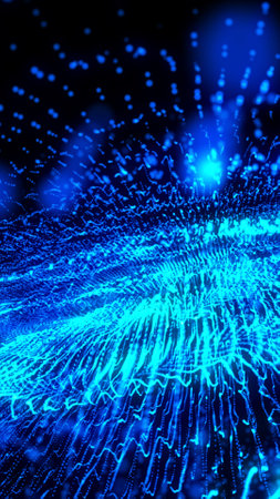 Exploding wave of luminous blue particles in motion against a dark background, resembling data streams or energy flows.