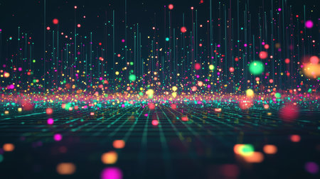 Colorful digital dots arranged in a perspective grid over a dark background, simulating a glowing data surface.