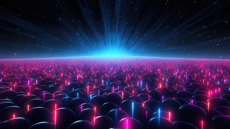 An abstract digital landscape filled with vibrant neon light trails, glowing particles, and geometric shapes in blue, green, pink, and purple.