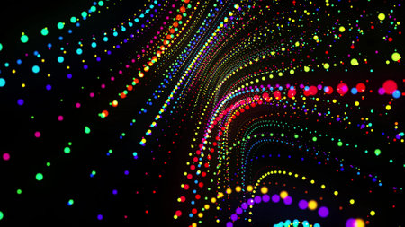 3d render. Abstract 3d background with glowing particles lined up in a row along curved lines in 3d space. Festive bg with multicolored particles. Motion design background.