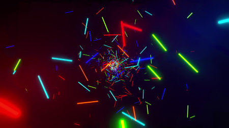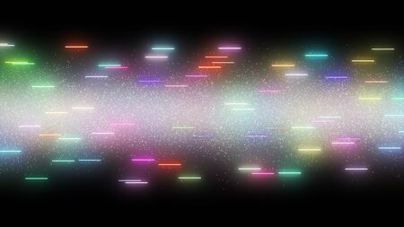 3D rendering of bright multi-colored particles fill the space with jets of energy and light. Shiny colorful abstract background for bright festive decoration