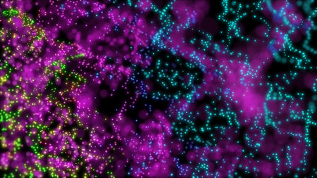 Abstract colorful particles swirling in deep purple space, forming glowing flowing trails and soft jelly-like structures.