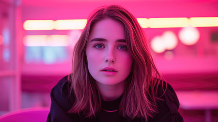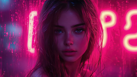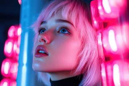 A close-up portrait of a woman illuminated by vibrant pink and blue neon lights, capturing the essence of modern photography, fashion, and creative lighting.