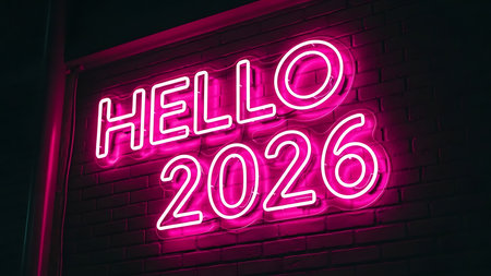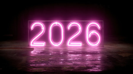 Bright neon sign displaying year 2026 in vibrant pink color, set against dark background, creating modern and futuristic atmosphere. Perfect for celebrations and events