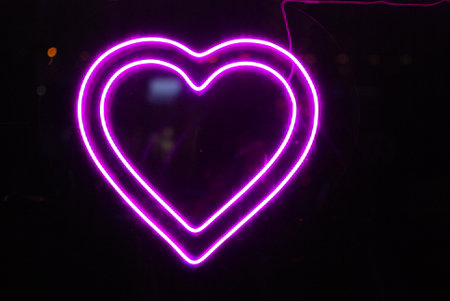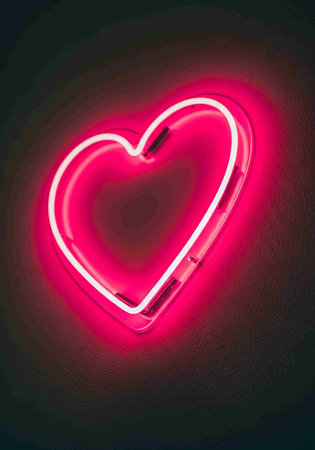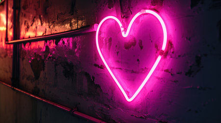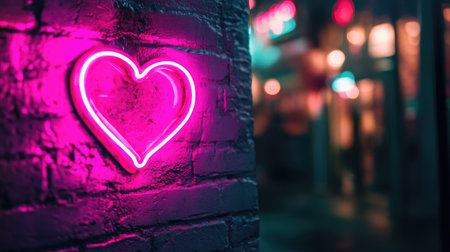 A glowing pink neon heart sign illuminates a textured brick wall, creating a vibrant and romantic atmosphere in an urban nighttime setting. Ideal for themes of love and nightlife.