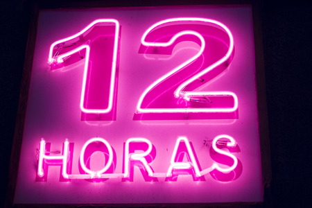 Pharmacy neon light chemists 12 hour open pink sign at night photo.