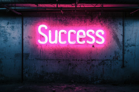 A Bright neon pink Success sign glowing on grungy concrete wall, symbolizing victory and determination in urban industrial setting