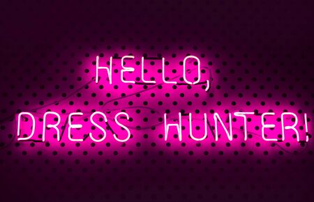 lilac neon inscription hello hunter dress, wall with a bright inscription, neon background, women's club, boutique for girls, sale of dresses