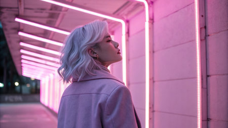 A person with shimmering silver hair is beautifully accented by a soft pink neon light. The combination creates a dreamlike quality emphasizing the elegance of their style..