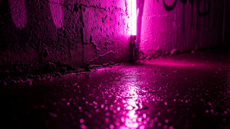 A close-up view of a rough concrete corner bathed in the intense glow of a pink neon light. The textured surface of the concrete, with its small pits and imperfections, contrasts sharply with the smooth, bright line of the neon tube. The light casts a vibrant magenta hue, creating a dramatic interplay of light and shadow. The background is a deep, enveloping black, emphasizing the illuminated corner and the stark geometry of the scene. This abstract composition evokes a sense of modern and...