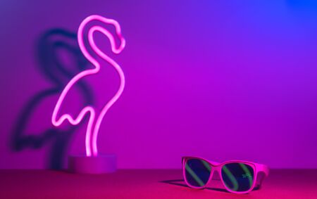 Summer time with flamingo,sunglasses refection neon pink and blue and green light on table with copy space.Trendy vacation holiday background