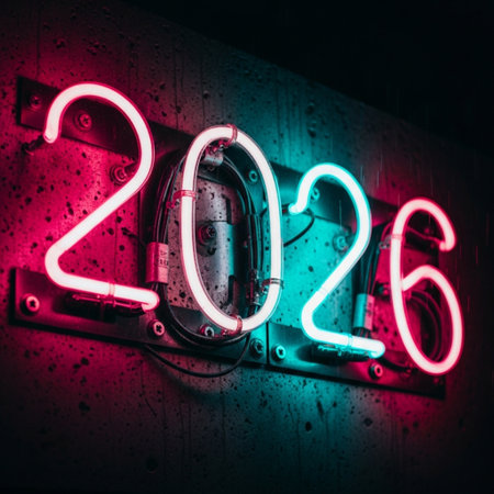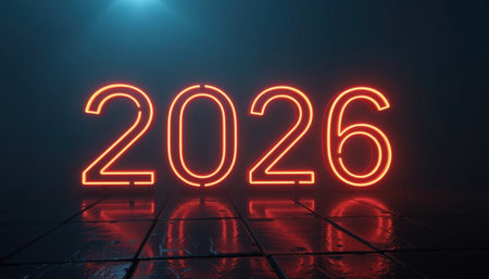 A glowing neon sign displays year 2026, set against dark, reflective background, creating futuristic atmosphere