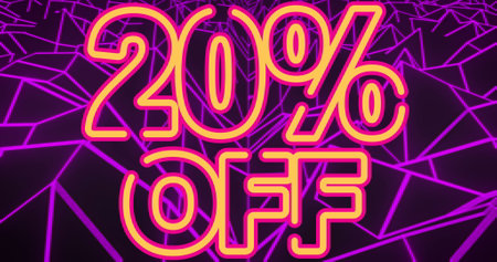 Image of 20 percent off neon text on purple cubes in background. retro retail and savings concept digitally generated image.