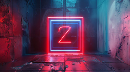 This is a 3D render of pink blue neon number two inside a square box glowing under ultraviolet light