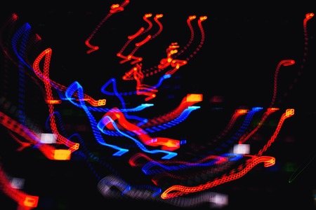 Abstract background of colorful lines in motion on black. Bokeh of defocused splashes, blurred red and blue neon leds, fireworks and salute, space and sky backdrop