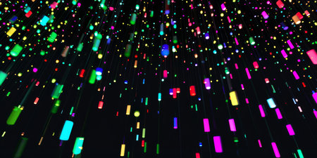 Bright dots and lines flow together in a lively display of color in a dark setting.