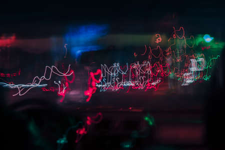 abstract background blurred colored marks from fast moving cars night road. Motion multicolored bokeh.