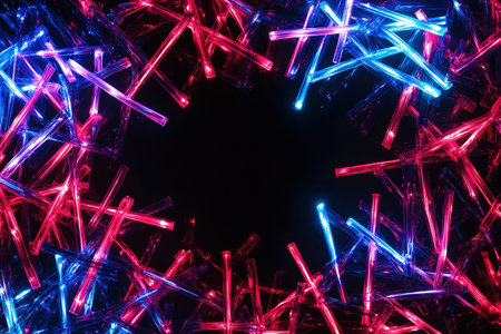 Neon light strips in red, blue, and purple intersect in captivating abstract patterns against a dark background, providing ample copy space for promotional content or graphics.
