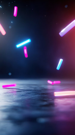 Vibrant neon light beams floating in a dark, reflective space, creating an abstract and futuristic atmosphere.