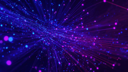 Dynamic network visual with glowing blue and pink particles, simulating movement in a dark space.