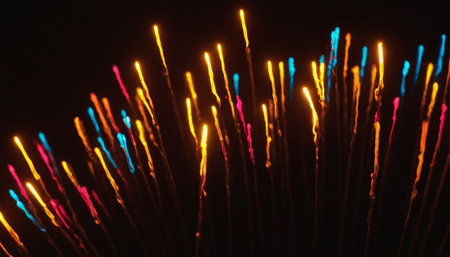 Close up of fiber optic cables on black background with colorful lights. generative ai