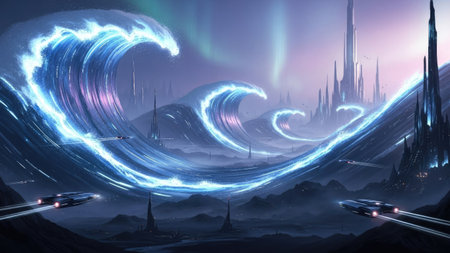 Mesmerizing electric waves illuminated by neon light create an otherworldly seascape. This artistic and tranquil scene captures beauty in digital abstraction.